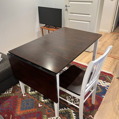 Kjøpt brukt og selges pent brukt. Stort og likevel nett/luftig møblement. Mørk lilla, for den som ønsker noe annet en det tradisjonelle. Det er 8 stoler. Flytter til minihus og må ha mindre møblement. Mål i annonse er på bordet og stoler har sittehøyde 45 cm, rygghøyde fra sete 45 cm og bredde på sete er også 45 cm. Velkommen til handel.