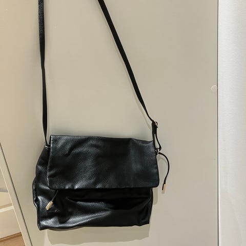 Fin og lett veske til salgs. Svart, ikke ekte skinn. Ca 27 cm lang, ca 16 cm høy. Ett rom inni og ett med glidelås. Lukkes vha to magnetknapper. Lite brukt, kun som «finveske».