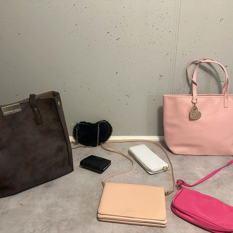 Stilig og spesiell veske til salgs! Kombinasjon av semsket og glatt «skinn», tror ikke det er ekte skinn. Fin pynt på magnetlåsen. Glidelåslomme bak. Inni er det ett stort rom, en liten åpen lomme og en lomme med glidelås. Ca 28 cm lang, 15 cm høy, ca 30 helt opp til «hankene».
