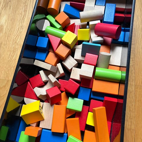 Byggeklosser til barn. Man kan bygge biler og fly og andre ting av det. Det er lite brukt, og brukt av et barn.
