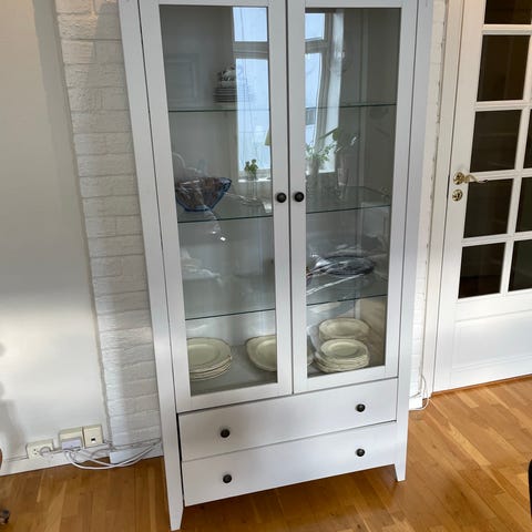 Fint brukt vitrineskap i hvitt med lys i skapet, og en fjernkontroll til å styre lyset.