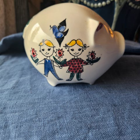 Morsom sparegris fra stavangerflint. Merket Kredittkassen. Lås under, men mangler dessverre nøkkel. Krakelert, men fortsatt fin.