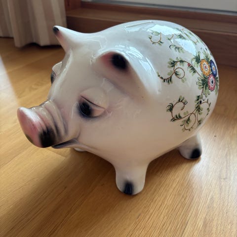 Morsom sparegris fra Stavangerflint. Merket Kredittkassen. Lås under, men mangler dessverre nøkkel. Krakelert, men fortsatt fin.