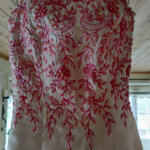 Gull / beige kjole / selskapskjole med tynne stropper til en spesiell anledning. Flotte folder / rysjer foran og fine sløyfelignende løse detaljer bak på kjolen. Har blitt brukt kun en kveld i skoleavslutning / skoleball, og kjolen fremstår som ny. Størrelsen er 38 eller M. Et skjerf i samme farge følger med. Kjolen kan styles både med og uten skjerf. Sko følger ikke med. Lengde på kjolen målt foran: ca. 141 cm. Lengde på kjolen målt bakfra: ca. 130 cm. Lengde på stropper: ca. 38 cm. Lengde+bredde på skjerfet: 185 x 35 cm.