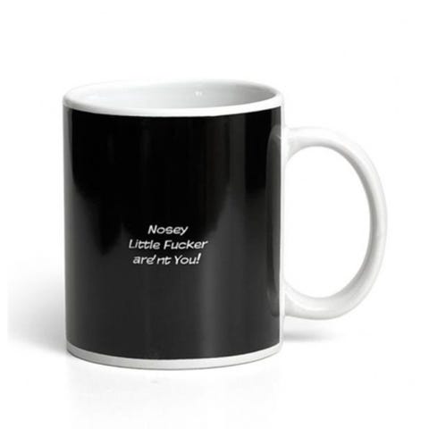 Med et grafisk bilde av bandet og logo på et svart krus
