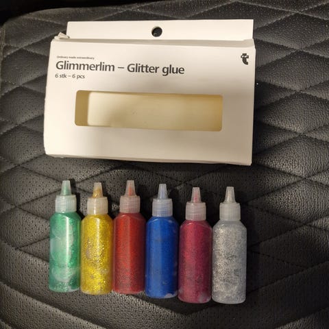 Det er lim med glitter og det er 45 stk.