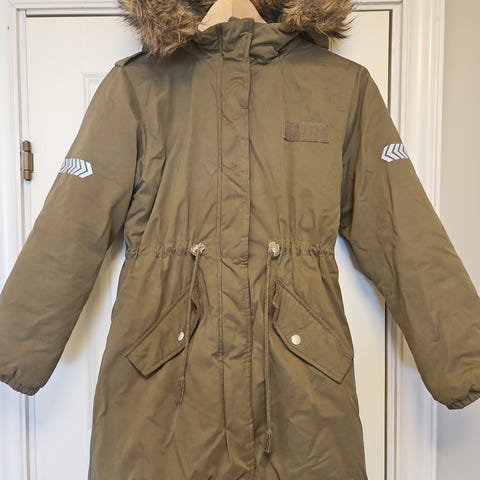 Vattert jakke med pelskrage, med vannavvisende stoff. Nydelig grønnfarge og korallfarget for. Str. 152.Brukt kun en sesong av et barn så her er det mye jakke for pengene😊