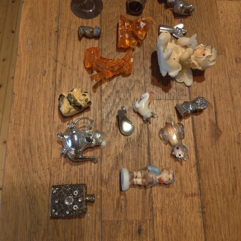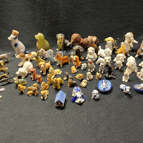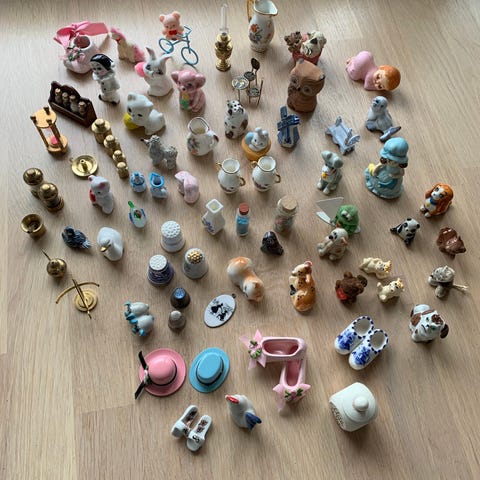 Diverse små figurer som har stått til pynt i settekasse. Typisk 90 - tallet. Mange forskjellige figurer selges samlet. Blåfisl har mistet et bein, men står likevel. Det samme med ene hunden.Kjøper betaler frakt.