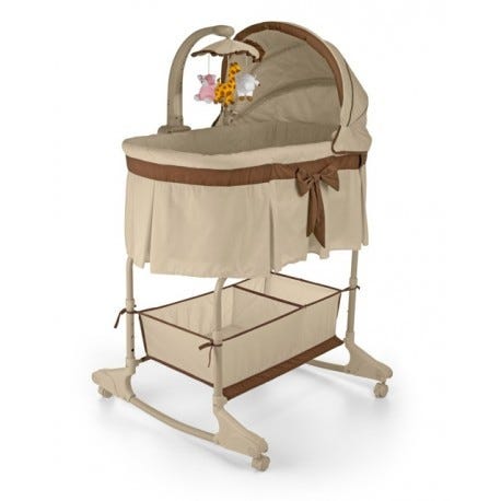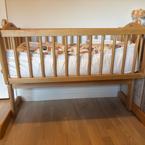 Vugge som ny selges. Bare stått til pynt med dukker i. Madrassmål er 75 cm x 65 cm. Fargen er mørk grønn med okergul pynt.