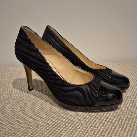 Høgl Svart og brun satengsko str. 4.5(37.5).Helhøyde ca 6 cm. Brukt en gang- som ny.