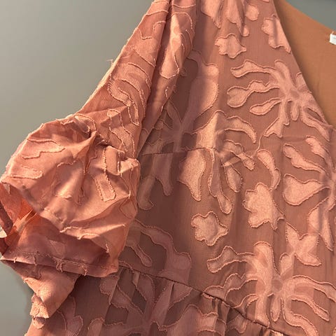Hundetannsmønster i sort, hvitt og rødt. Rysje med splitt langs nedre rand. Knyting i halsen. 100. % polyester.
