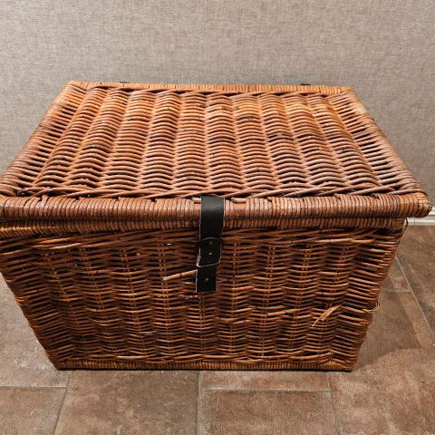 Flettet kiste med hengslet lokk og håndtak i sidene.