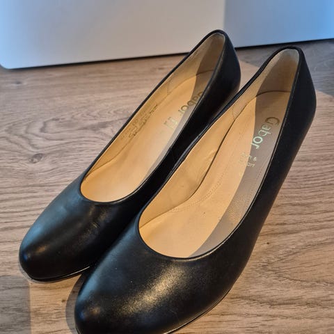 Stiliga pumps från kvalitetsmärket Gabor, sort, lätt glimrande stoff. Perfekta för fest. Mycket bekväma att gå i om man kan gå i höghälat. Gabor är kända för sina bekväma skor i bra kvalitet.