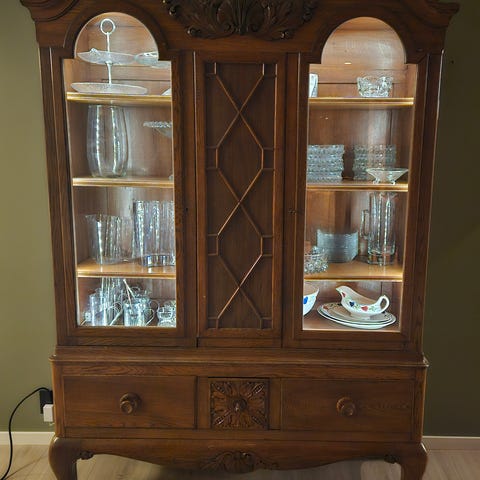 Antikk skap med ovalt speil, dekorative gullfargede detaljer og to skapdører med glassinnlegg. Skapet har flere skuffer og skapdører for oppbevaring. Mørk grønn farge med gull dekorative elementer.