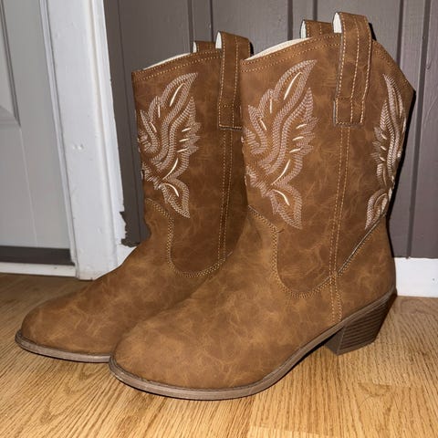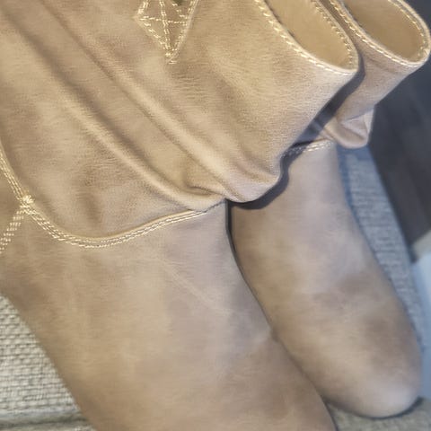 Boots, brune (ikke ekte skinn, noe fargeavvik) str 36, hæl 5 cm, ikke brukt. Selges for kr 200,-. Evt fraktkostnader kommer i tillegg.