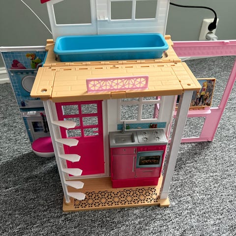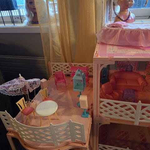 Selger et fint barbiehus med alle møblene vist på bildene. Det er en del bruksmerker, men det ser fint ut allikevel. Alt fungerer som det skal. Bare henting.