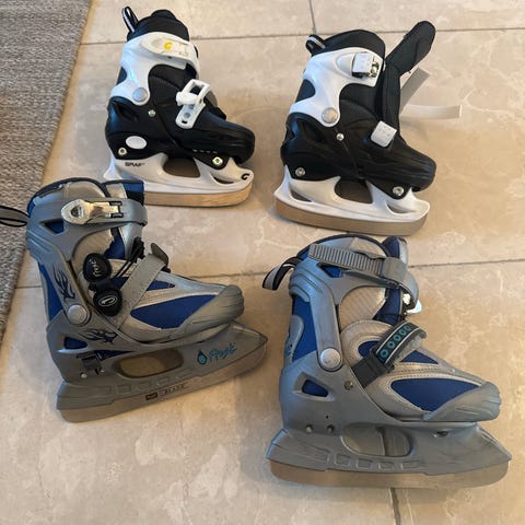 Rosa og hvite skøyter til barn. Til ishockey. Kan justere størrelsen fra 27 til 30. godt brukt, men fungerer helt fint.