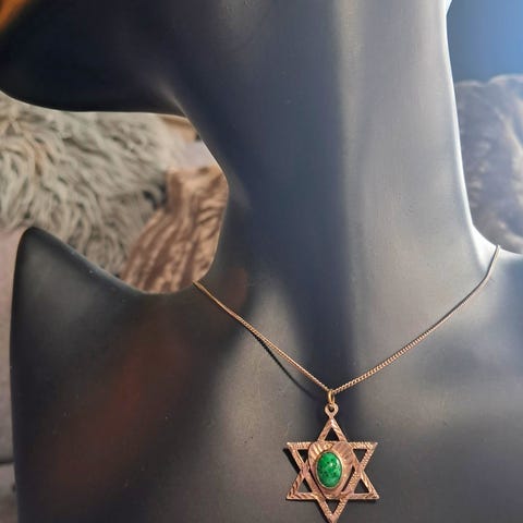 Nytt, ubrukt smykke med gullfarget kjede og lås. Smykket har et vakkert grønt/gull anheng med måne og stjerne.