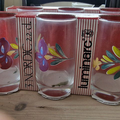 Fransk, fargerik retro karaffel med seks små glass