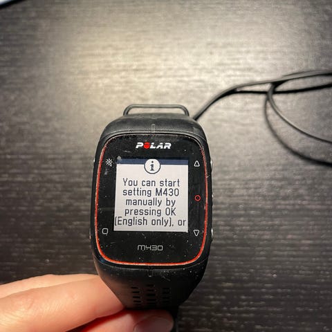Dette her er en ganske pent brukt polar M430 klokke. Den er en del år gammel, men ikke brukt på en god stund og har bare ligget i en skuff på rommet pga jeg kjøpte meg en ny klokke.