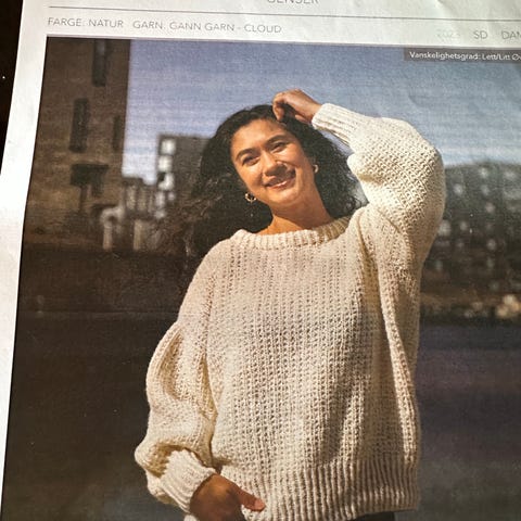 Supersøt strikketopp i garnet brushed alpaca Silk og Cotton mérinos, fra Garnhimmelen. Strikket i halvpatent, er løssittende med vide ermer. Kun brukt en gang. Selges billig pga en liten feilstrikking i en omgang(se bilde to).