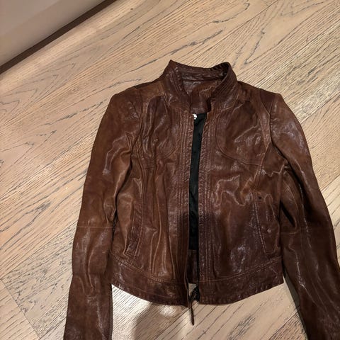 Pen, enkel skinnjakke med glidlås. God lengde i ermene. Passer fint til dressbukse eller skjørt, brukt som jobbklær