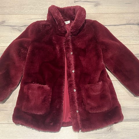 Selger en utrolig stilig og unik vendbar jakke i str. 128. Ene siden er en klassisk, beige jakke med fine detaljer og fuskepels langs kanter, mens den andre siden er en helfôret, myk fuskepelsjakke – to jakker i én!