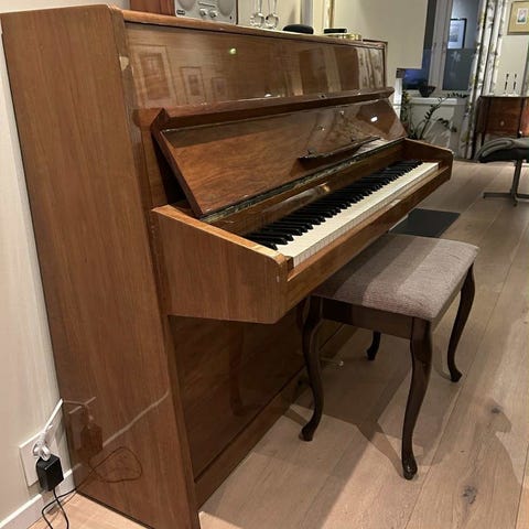 Pent piano av merket GEYER fra 1950-tallet. Målene er 143x57x111cm. Det er ikke blitt spilt på på en stund, men god klang allikevel. Noen bruksmerker. Kjøper må hente og bære, det står 1.etasje.