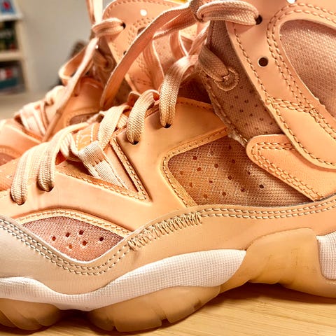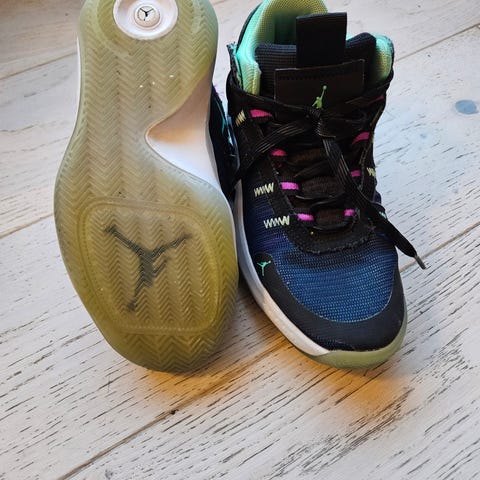 Gode Nike Jordan basketsko. Brukt inne i hall til trening og kamper 1 sesong. Str 38. Inner mål såle 24 cm. Noe slitasje øverst innside ankel begge sko (se bilde 3) ellers hele og fine. Gode såler og passform.