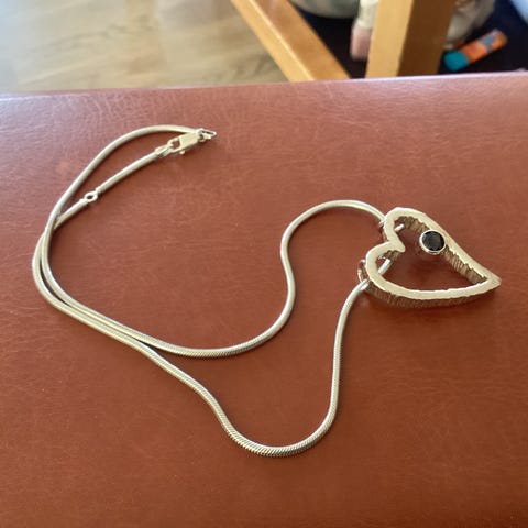 Nesten ubrukt halskjede i stål selges.Tror esken tilhører smykket, men ikke sikker. KI foreslo Aarikka.