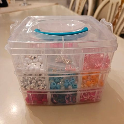 Helt fulle bokser. De ble aldri brukt og nå er barna for store. En av dem fikk påfyll av litt div perler vi hadde hjemme.