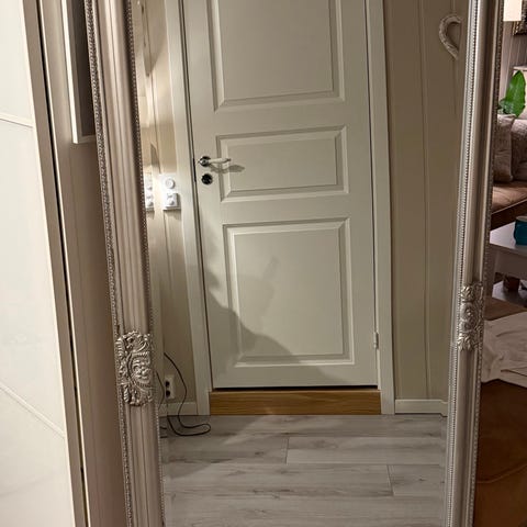 Selger et vakkert og dekorativt helfigurspeil i vintage stil. Speilet har en solid ramme med flotte utskjæringer og detaljer i kremhvit farge. Det kan enten plasseres frittstående med støtteben eller lenes mot en vegg.