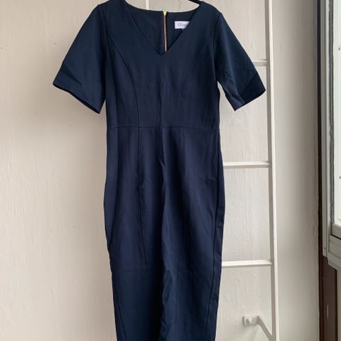 Veldig fin kjole fra Closet London. Bodycon-/blyantskjørt-/pencil skirt-fasong med knytting i livet som markerer midjen. Bredt belte i samme stoff følger med og kan knyttes på ulike vis. Kan brukes både til hverdag og fest. I en nydelig dyp burgunder-/plommefarge.