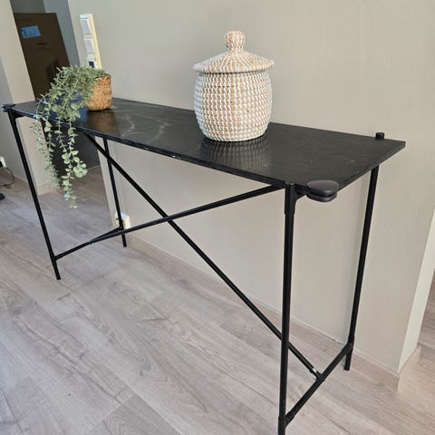 Svart understell med hvit marmor på topp platen. Bordet er ferdig montert med ben.