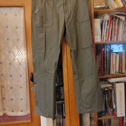 Pent brukt bukse i ridebukse-stil fra Lindex. Dvs at lårene er vide, men livet er smalt. Det står str. 42 i buksa, men fordi livet bare måler 78 cm, er nok dette en str. 38. Nydelig mosegrønn farge. Stoffet er mykt og lun flanell, dvs. 100% bomull. Romslige skrå lommer foran. En lomme bak.