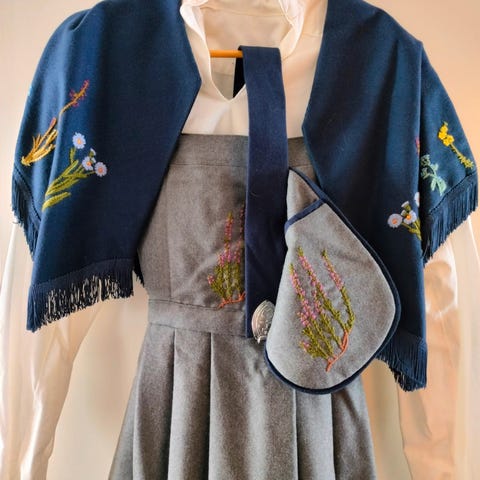 Drakt med skjorte, belte med veske og sølv med boks: 23.000kr
