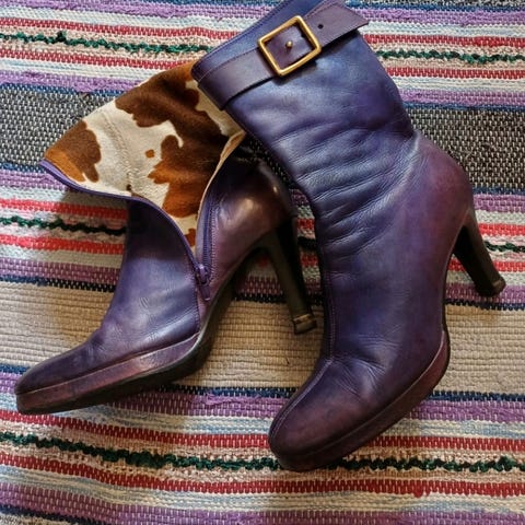 Spiss tå, behagelig høyde på hel, semsket skinn. Lite brukt.