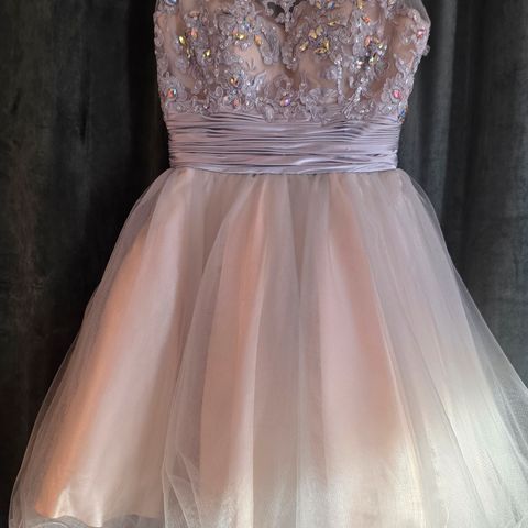 Selger lys blågrå kjole. Nydelig mønster. Str ca S, men er justerbar med knyting bak, så kan tilpasses noe. Ikke brukt, da den ble litt for liten her.