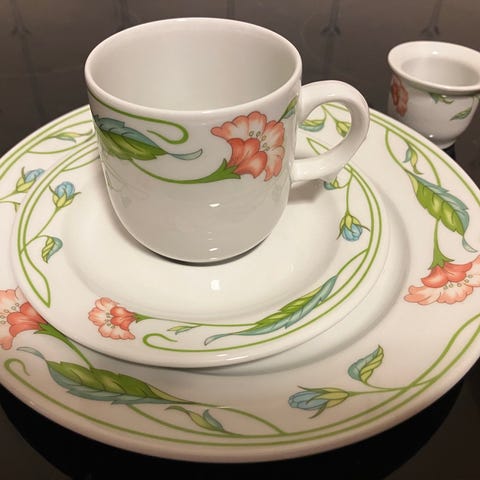Figgjo Flora serviset består av kopper, skåler og flate tallerkener med blå og grønne blomsterdetaljer og gullkant. Materialet er keramikk. Serviset er egnet for servering av kaffe og mat.