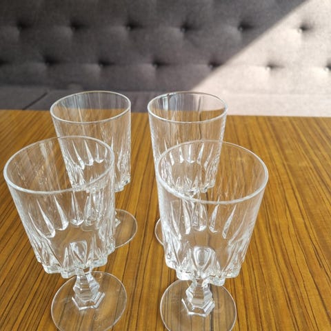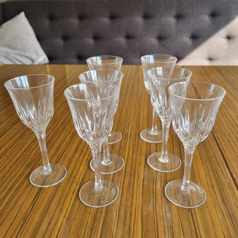 12 stk gamle glass med mønster. Arvet. Usikker på om de er i glass eller krystall. Rommer omtrent 1,2 dl.