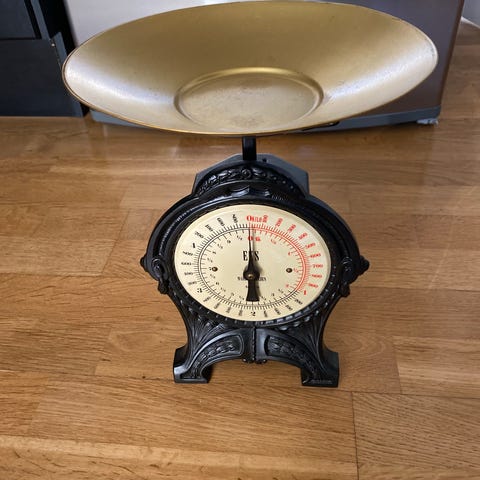 Pen gammel kjøkkenvekt i støpejern. Vektskålen er malt sort.