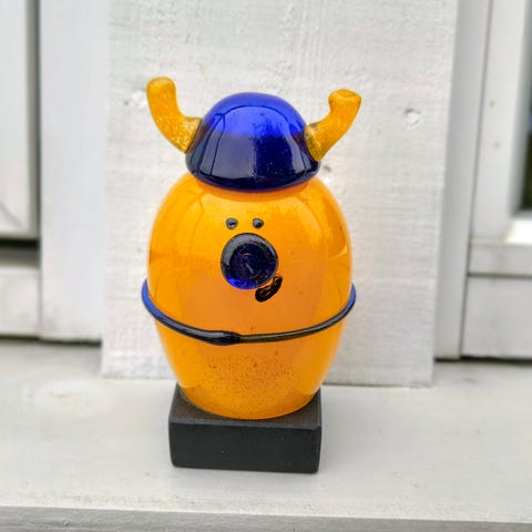 En fargerik, håndlaget fiskefigur med et sjarmerende uttrykk. Passer perfekt som en liten dekorasjon på en hylle, et skrivebord eller i en maritim innredning. Se bilder for mål. 🐠
