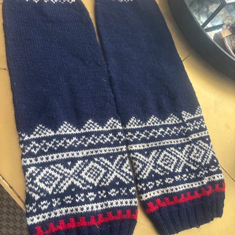 En klassisk, varm og flott strikkegenser i ull med tradisjonelt mønster i hvitt og blått. Perfekt til kalde dager, hytteturer eller vinteraktiviteter. Et hull på høyre albue (kan sikkert fikses av noen som er flink til å sy – se bilde). Klør litt, men perfekt over annet tøy – slik man pleier å bruke ull om vinteren. 😉
