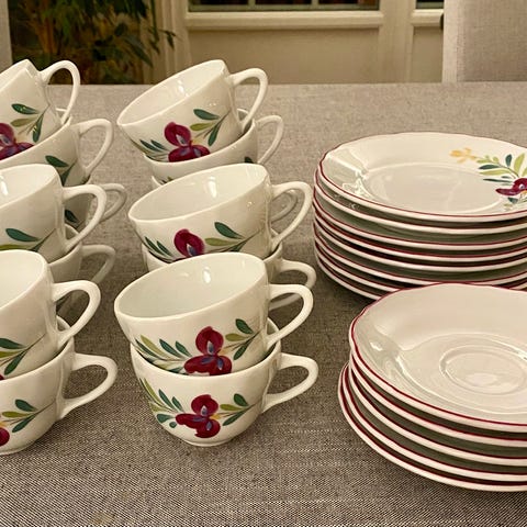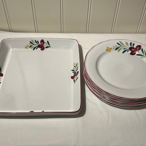 11 talerkner + 8 tefat + 5 kaffekopper + 1 fløtemugge og skål. Selges samlet.