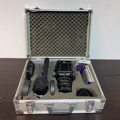 Veske og rem er originale og ganske slitt som det ses av bilde. Det følger også med en ekstra zoomlinse. Og originalbruksanvisning 😊