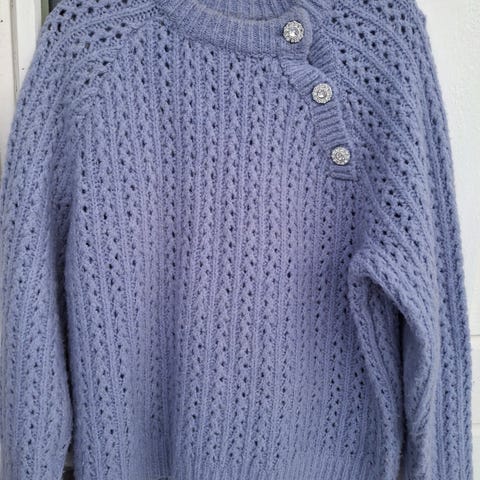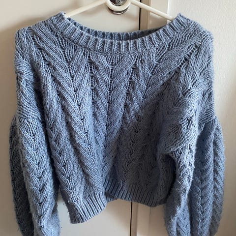 Selger denne pene hjemmestrikkede genseren i en fin blåtone.