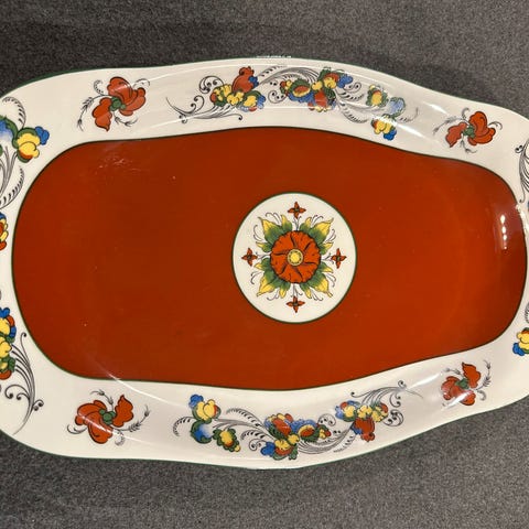 Porsgrund terrin med lokk/lokkefat. Merket med stempel som ble brukt fra 1911 - 1935. Stor terrin med veldig pent motiv. Den har en liten sprekk i lokket, men lite synlig. Ellers veldig pen og dekorativ.
