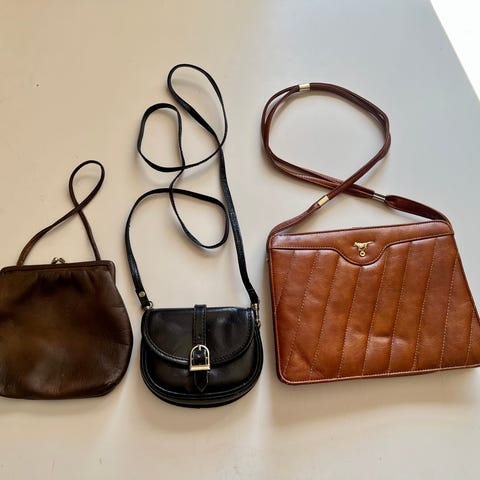 - Veske i skinn, blå med brune detaljer, foring, lukning med glidelås, 22 x 18 cm, kr 199.