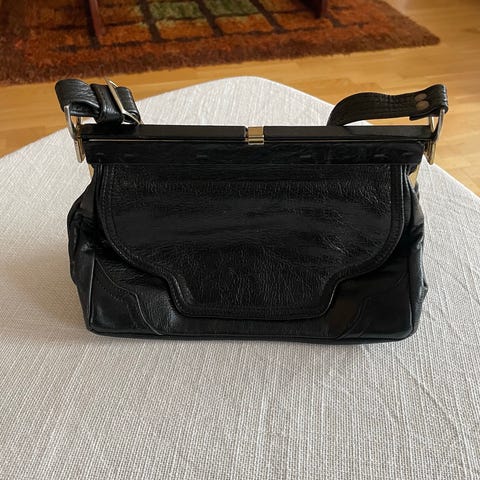 -Veske i sort skinn fra Jolly Bag. Med foring, to lommer inni med glidelås. Stor ytterlomme med trykknapp og mange små rom med glidelås. Skulderstropp med regulering. 30 x 19 cm, kr 299.