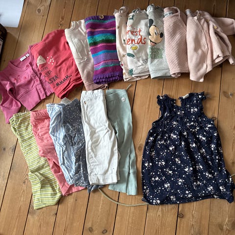 En trøye, en ull pyjamas, en pyjamas, en ullstrømpebukse, to strømpebukser, en bukse, en ullbody, to gensre.